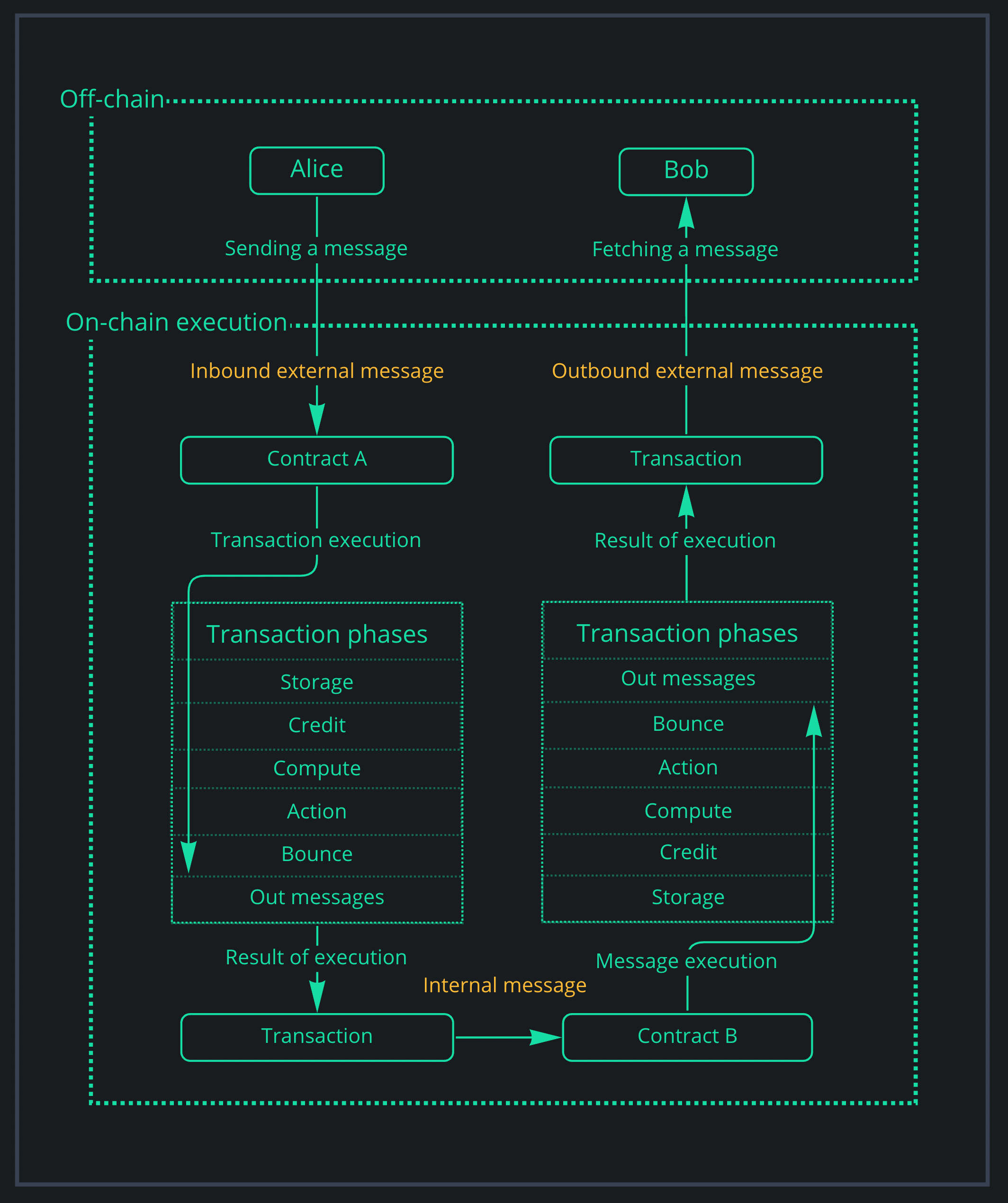 **Bounce:** in case of an error was thrown at stages (3, 4) of the transaction execution, the transaction will immediately go into the bounce phase, skipping the rest of the phases. Also, if a '*bounce*' flag was specified, a message will be sent back to the sender on the onBounce callback function.